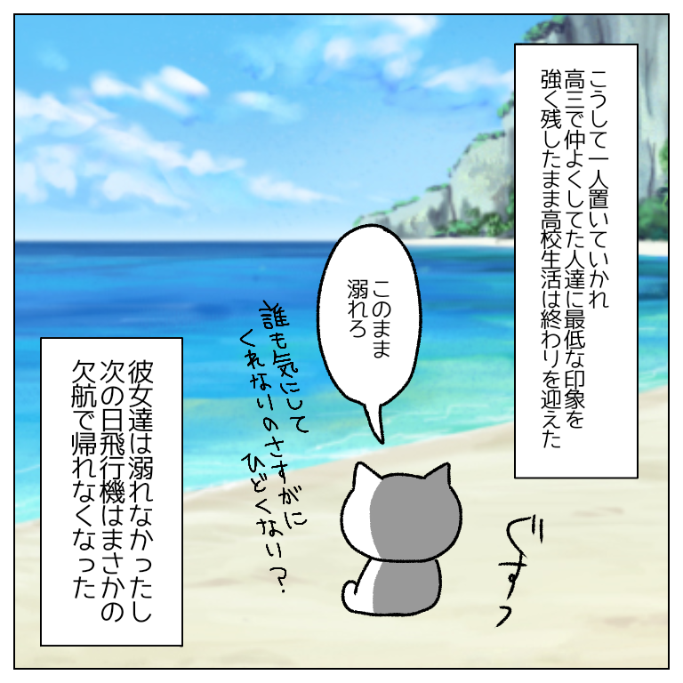 一応書いておきますがいじめられてたわけではありませんwただ単に旅行でテンション上がって周りが見えなくなっただけだと思います。でもせめて最初に一緒に一緒にホエールウォッチング行こうって言った子ぐらいは気にしてほしかった!旅行中だし空気悪くなるのも気まずくて当時は強く言えなかったよ…。