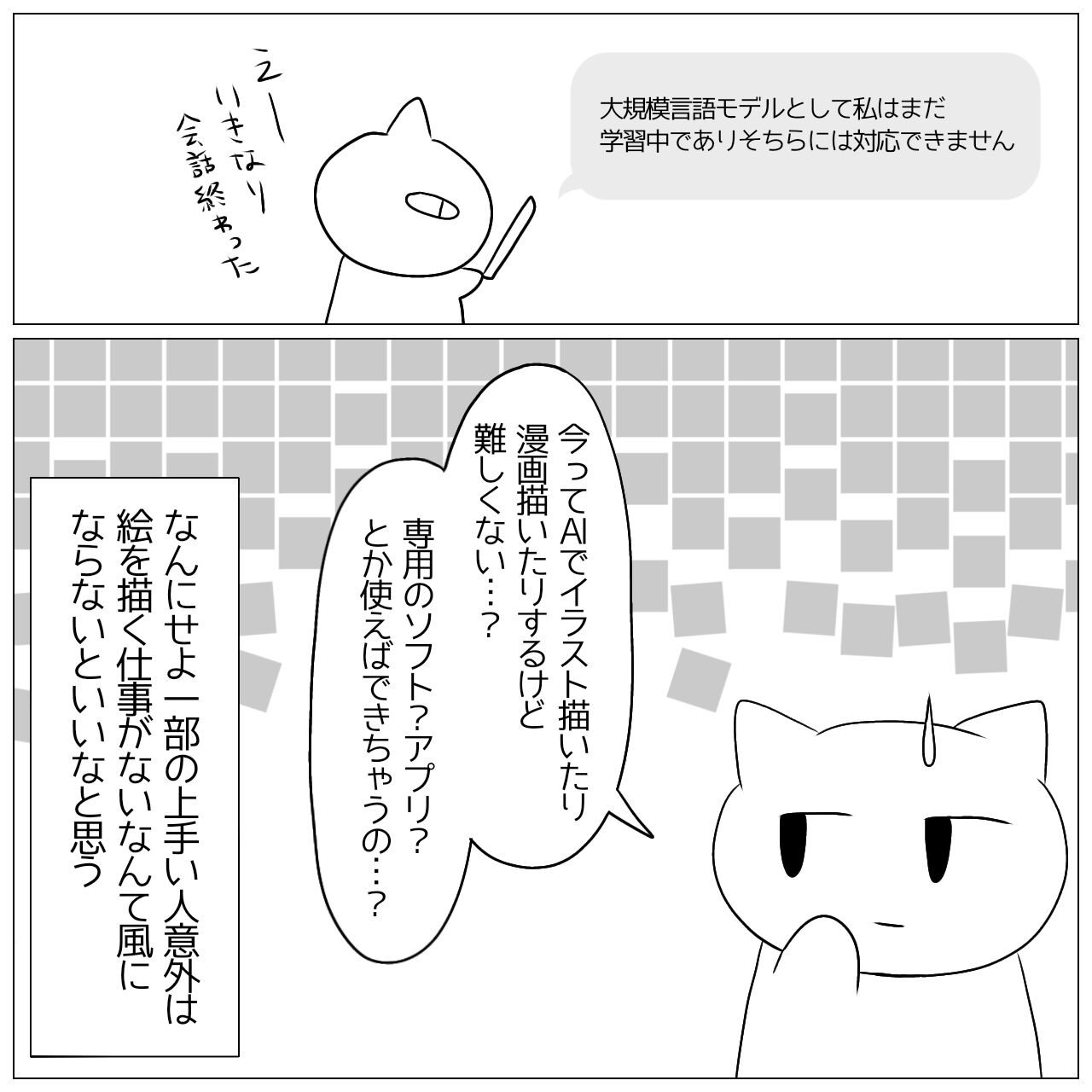 2025年06月17日 AIで漫画を描くということ すごい技術だしこれからどんどん普及していくだろうけどやっぱうーんって思うとこもあるのよね。ずっと自力で描いてきてる絵師さんがAIの絵みたいとか言われてたりすると…。AIはいろんな絵師さんの絵で学んでるからAIがその人の絵に似てるんじゃん。あとシンプルに仕事なくなったら嫌だ。今まで描いてきた漫画のよりすぐりをまとめたものがKindleでリリースされました!こちらからダウンロードできます! 「日常」カテゴリの最新記事